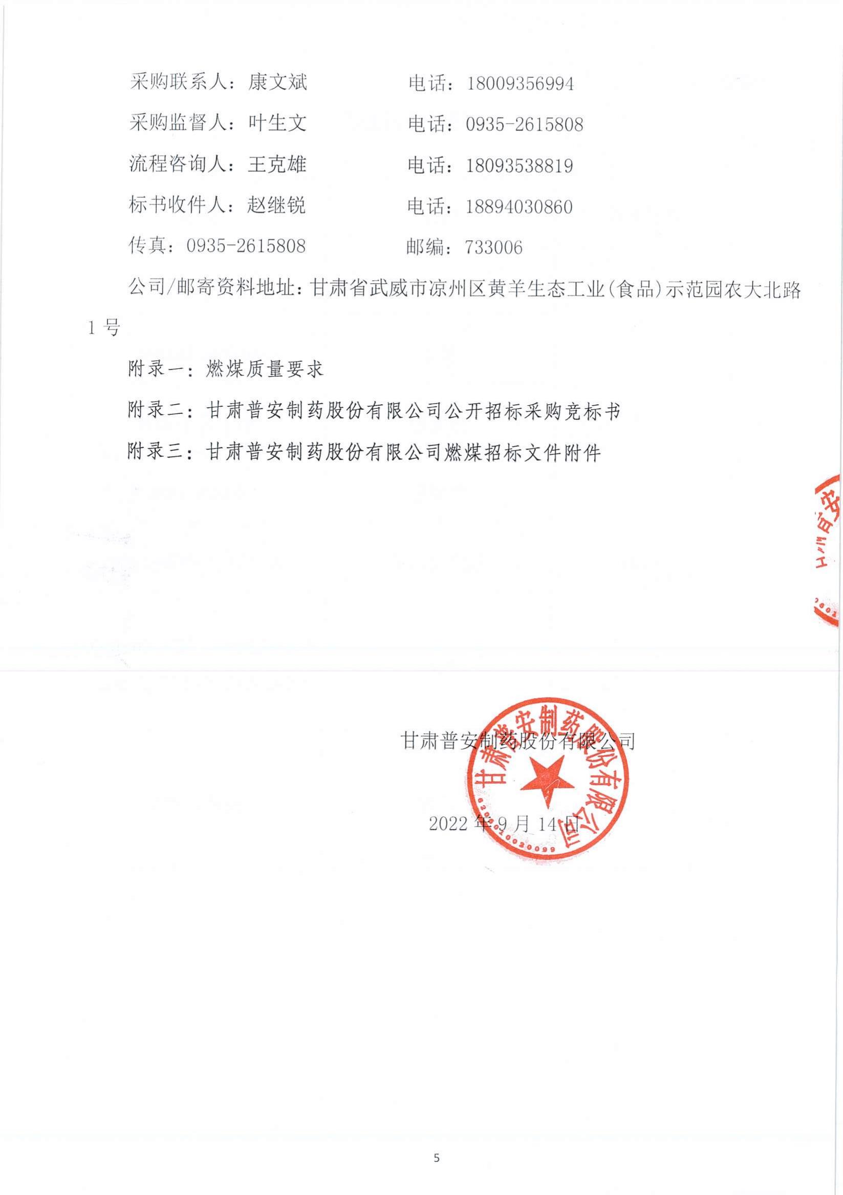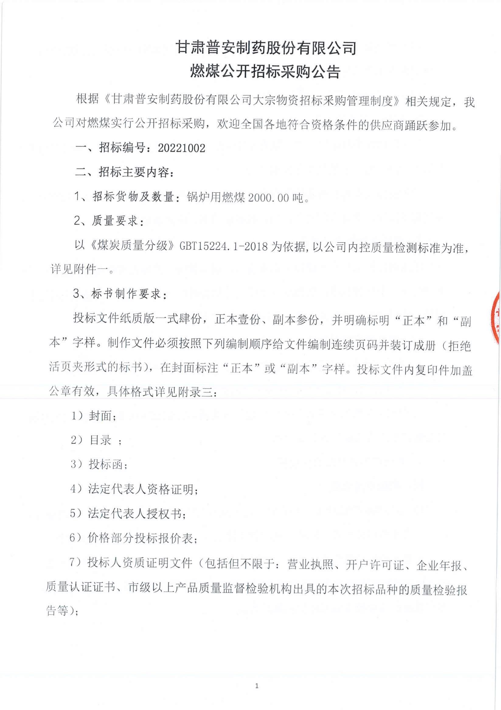 甘肅普安制藥股份有限公司燃煤公開招標采購公告