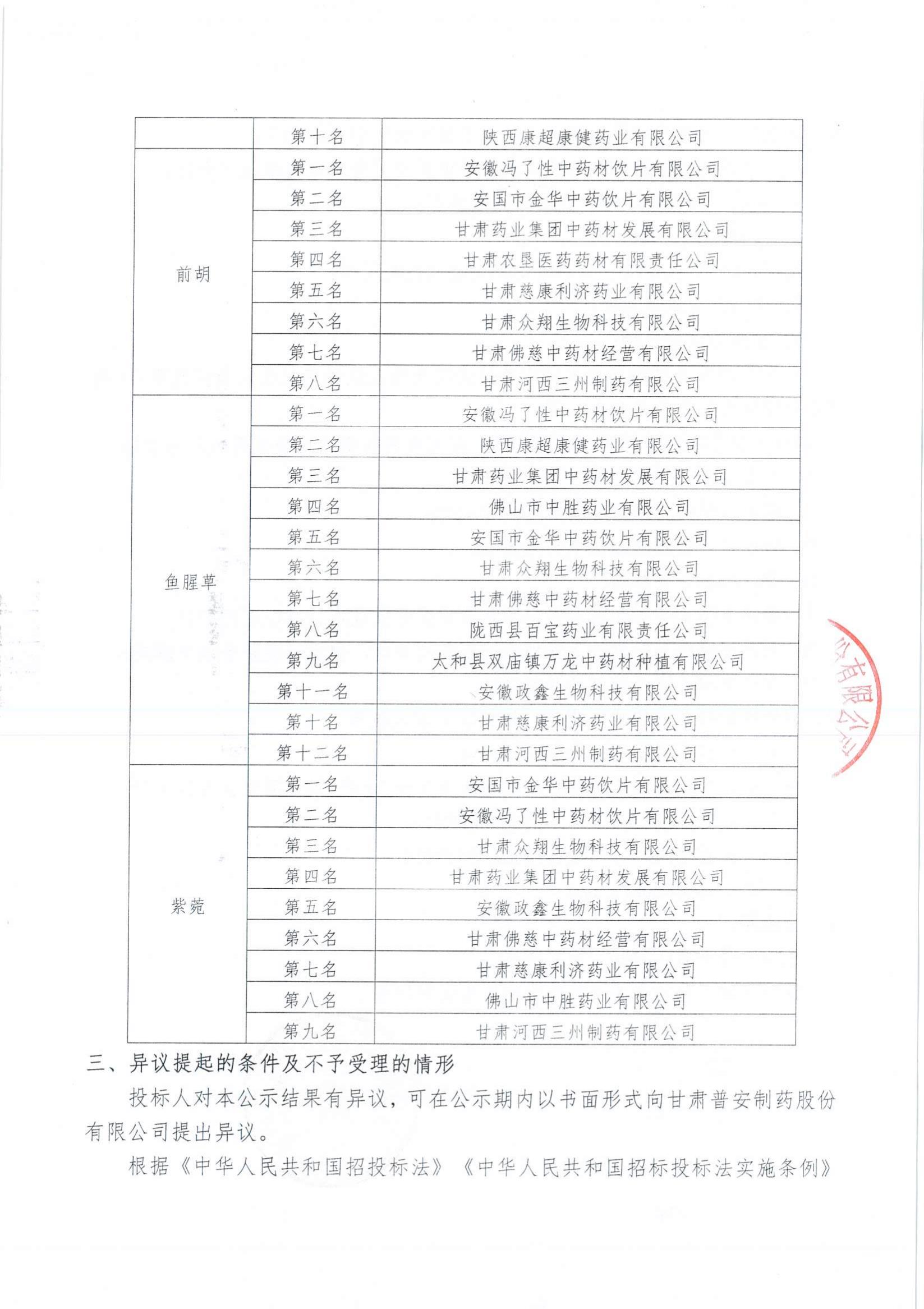 甘肅普安制藥股份有限公司2022年10月-2023年10月中藥材招評標結果公示