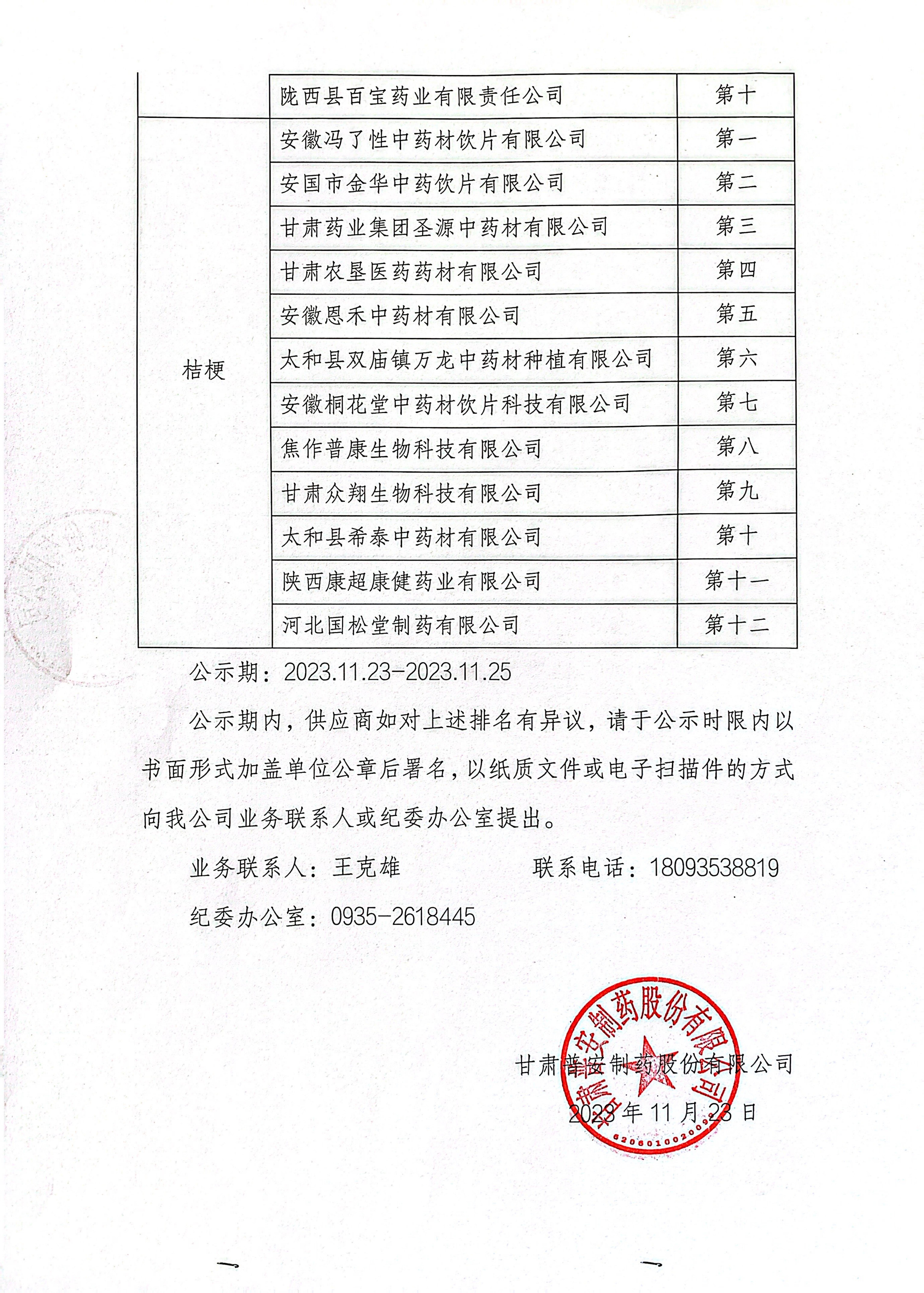 甘肅普安制藥股份有限公司2024年度宣肺止嗽合劑中藥材競爭性磋商結果公示