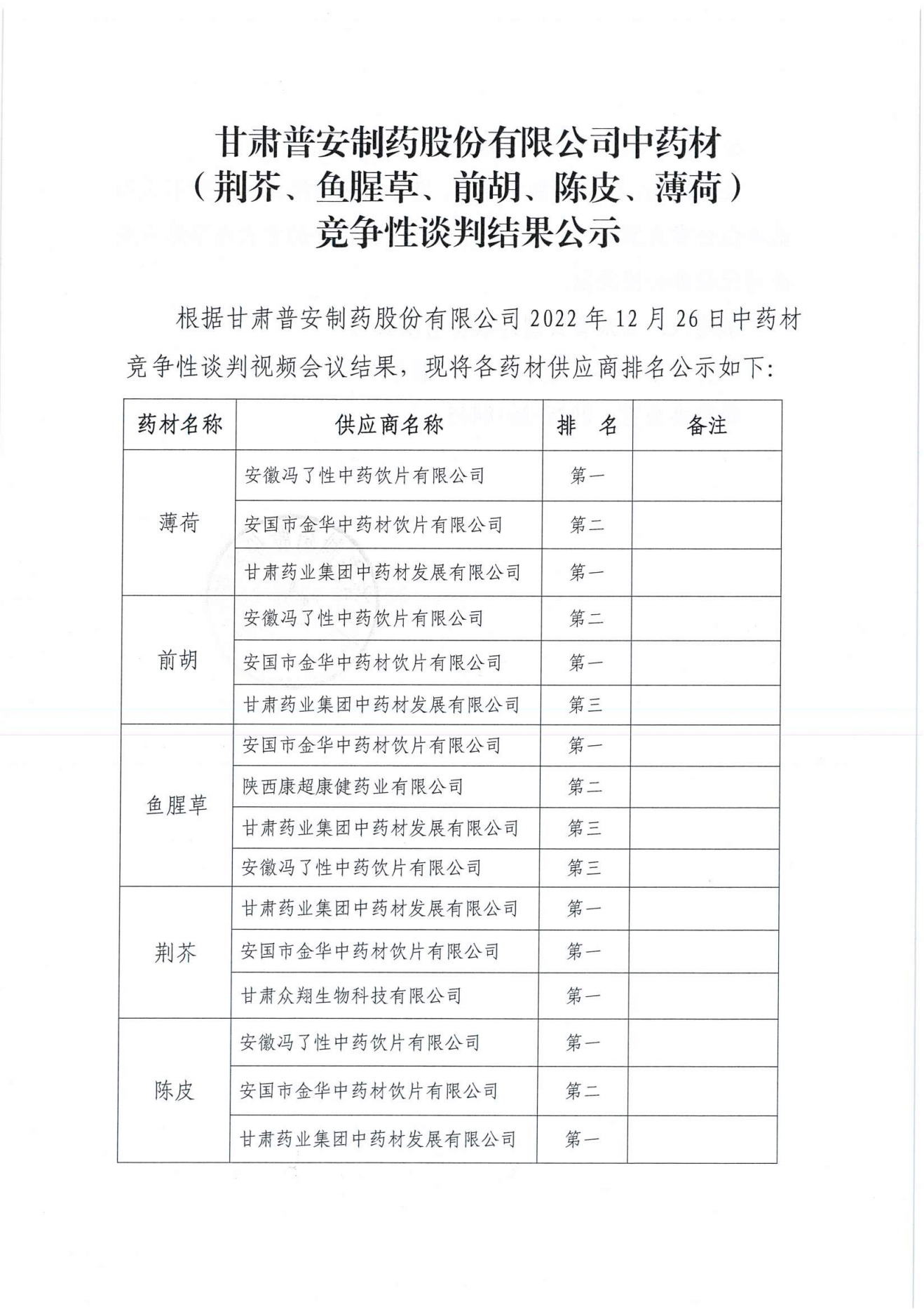 甘肅普安制藥股份有限公司 中藥材(荊芥、魚(yú)腥草、前胡、陳皮、薄荷)競(jìng)爭(zhēng)性談判結(jié)果公示