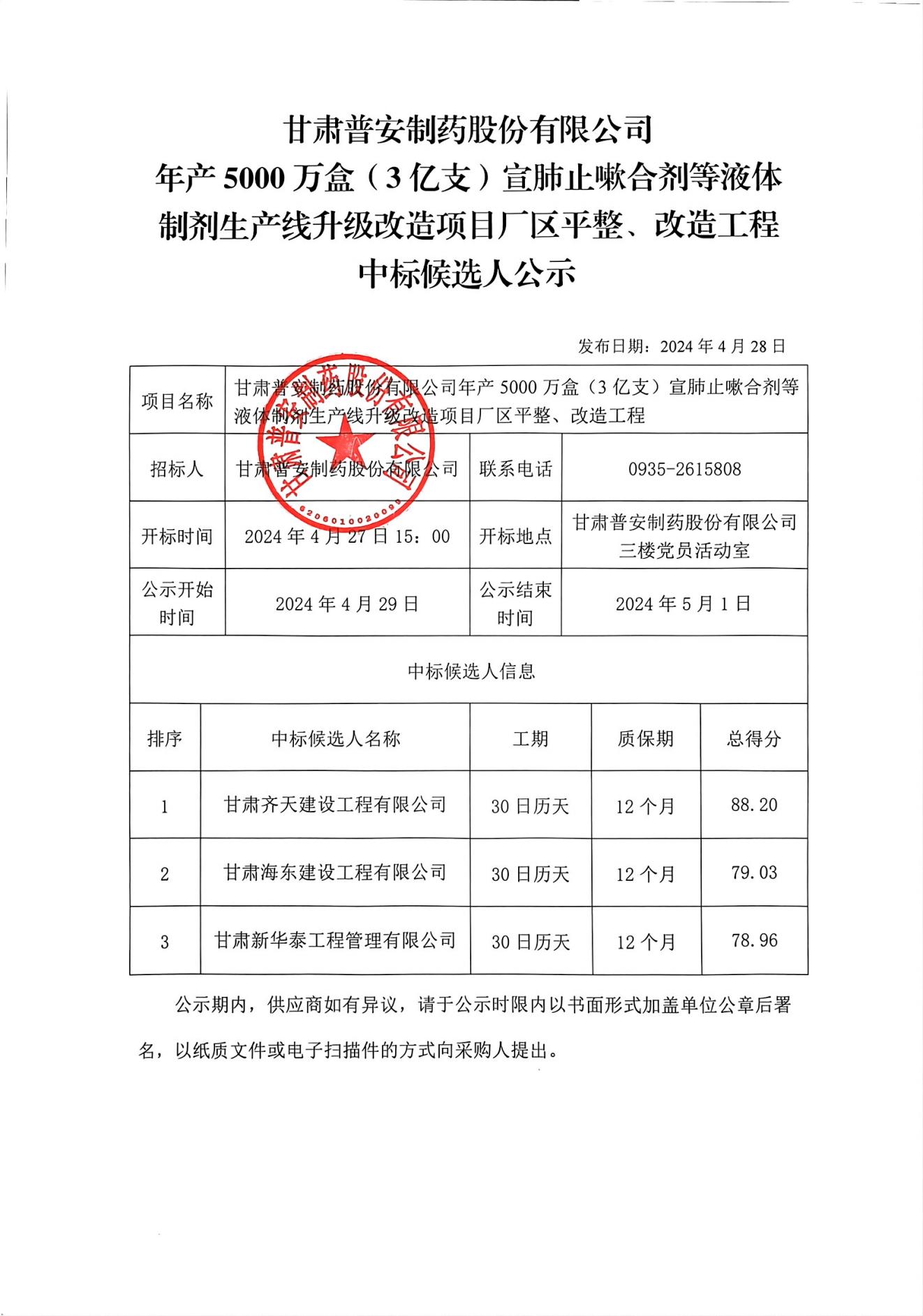 甘肅普安制藥股份有限公司年產(chǎn)5000萬(wàn)盒(3億支)宣肺止嗽合劑等液體制劑生產(chǎn)線(xiàn)升級(jí)改造項(xiàng)目廠(chǎng)區(qū)平整、改造工程中標(biāo)候選人公示